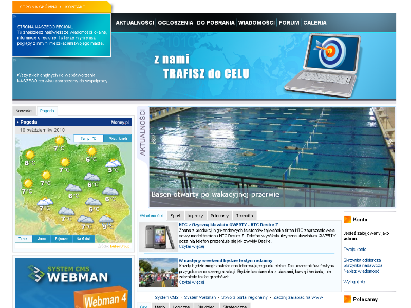 Szablon target został umiejscowiony w module kompozycje. Tu też można rekonfigurować tekst nagłówków (STRONA NASZEGO REGIONU..., Wszystkich chętnych...). Górne menu zmieniamy z poziomu modułu menu - górne.